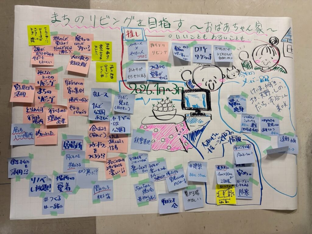 ですが、愛着がないと実行できないのでは?という疑問も生まれ、「持ち寄りリビング」というアイデアが出ました。こちらの空き店舗は昔高齢者の方々が野菜や着物を売っていたようで、おばあちゃんの知恵のようなものを共有しながら一緒にいまの空き店舗を盛り上げていこうという声もありました。
