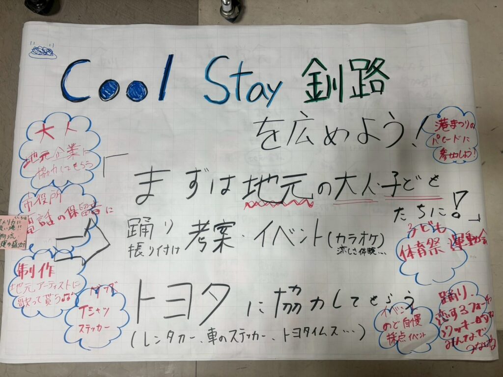 僕たちは「Cool Stay 釧路を広めよう」というテーマで考えたのですが、そもそも地元に知られていないのでは?という大きな課題があることに気づきました。そこで、知ってもらうために何ができるかを考えていきました。