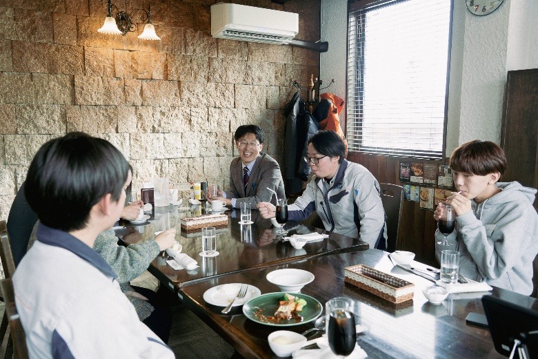 太平洋設備でのワーク後は場所を移動し、ランチを食べながら若手社員との座談会。