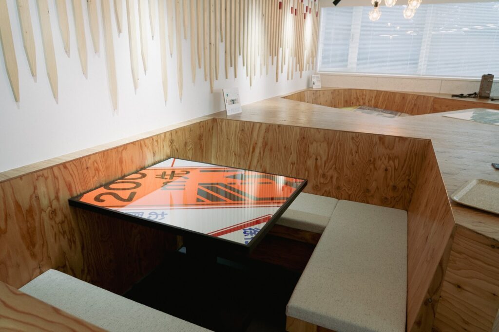 佐々木建設での事業説明に使用させていただいたコラボレーションエリアは、佐々木建設で出た廃材などを活用して自社でデザインされたワークルームで、社員だけでなく社長も一緒になって話し合いながら作り上げられた空間。