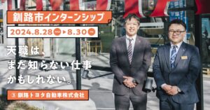 この夏、就職活動に向けて釧路市とドット道東がお届けするインターンプログラム「#道東天職活動」。 学生のみなさんに、まだ知らない仕事の世界や裏側があるかもしれない、ということを一つでも多く見つけてもらいたく、釧路に本社があ … 続きを読む 【釧路でインターンシップ!】お客様と関係性を築くことで、誰かの人生に寄り添う車を届ける〜釧路トヨタ自動車株式会社【#道東天職活動】