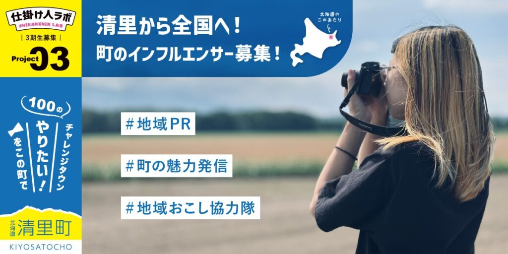 北海道清里町で情報発信プロジェクト始動!町の魅力やイベントをSNSや動画で全国へ届けるプロジェクトです。現場の熱量をそのまま発信し、地域のファンづくりに挑戦しませんか?企画から撮影・編集まで一貫して関われるので、広報スキルを磨きたい方にピッタリのプロジェクトです!自身のスキルを活かして清里町のインフルエンサーになりましょう!